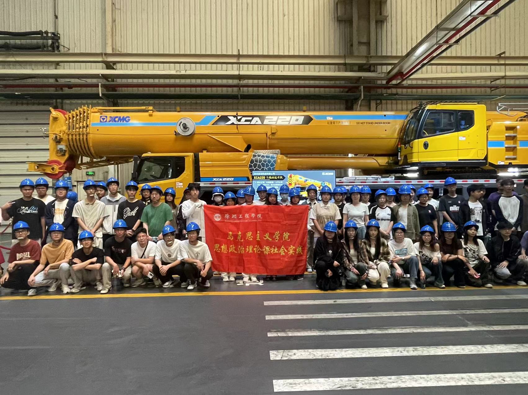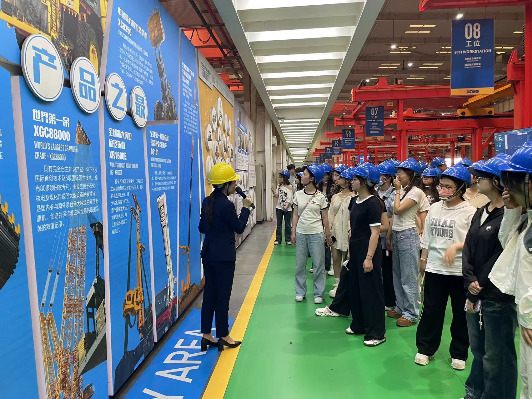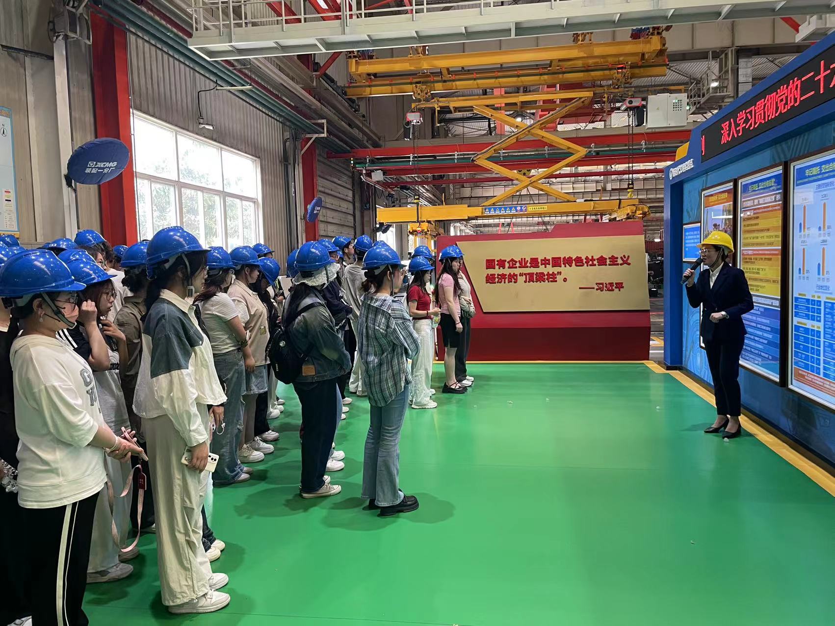 全体师生在徐工集团工作人员的热情引领下,沿着2017年12月12日习近平总书记考察徐工重型时的线路,走入5G全价值链智能工厂重型E4装配车间。在习近平总书记寄语“国有企业是中国特色社会主义经济的‘顶梁柱’”宣传展板旁,聆听工作人员讲解徐工集团牢记嘱托、感恩奋进、勇挑大任所取得的成绩。随后,参观了先进的生产设备与高度自动化的装配工作流水线;详细了解了徐工集团实现关键技术、关键设备突破,制造的全球最大塔机、中国最大吨位装载机、全球起重能力最强全地面起重机等“大国重器”;深入学习了徐工集团“五个坚持不动摇”、新时代徐工企业精神、新时代徐工大器文化理念谱系等精神与品质,以及徐工集团加快实现高水平科技自立自强、在高质量发展上继续走在前列、始终走在前列,打造世界级先进制造业集群和享誉全球的“工程机械之都”的责任与担当。