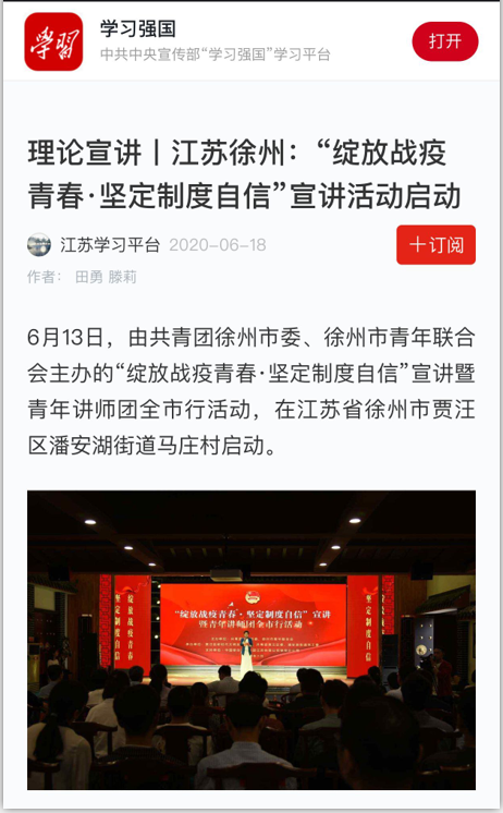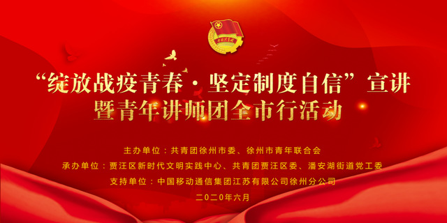 6月13日,由共青团江苏省委发起,共青团徐州市委、徐州市青年联合会主办的“绽放战疫青春·坚定制度自信”宣讲暨青年讲师团全市行活动,在江苏省徐州市贾汪区潘安湖街道马庄村启动。该项活动历时半年,徐州市将组织全市各级青年讲师团成员、抗疫一线青年榜样来到青年身边、走进青年群体,开展“进公司、进企业、进农村、进社区、进网络”的“五进”宣讲活动,广泛讲述优秀青年事迹,宣讲中国制度优势,讲好中国抗疫故事,传播青春正能量。