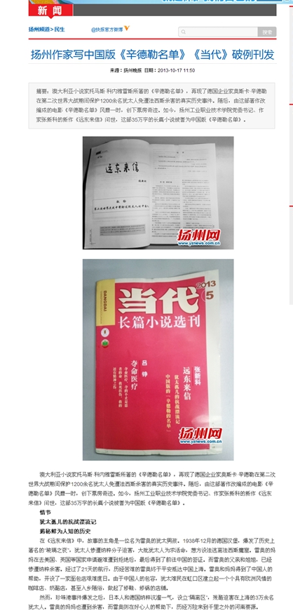 扬州网及扬州报纸对《当代》长篇小说选刊刊发张新科小说《远东来信》的报道